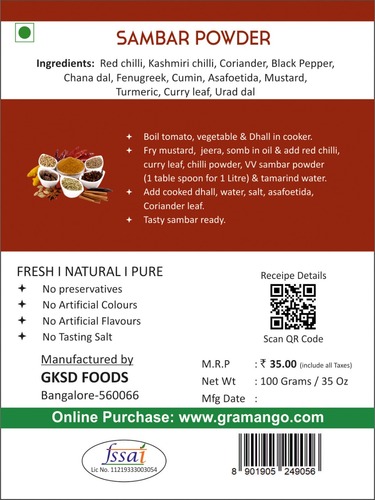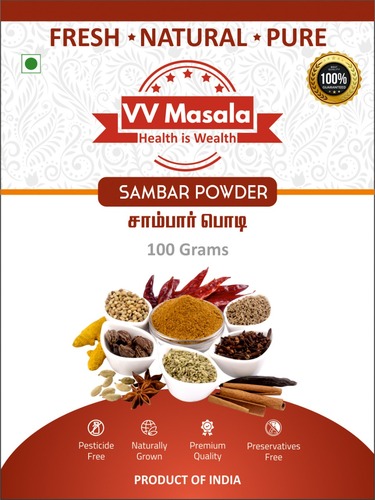 Made with spices sourced from certified farms across India,Sambar Powder is the next best thing to homemade recipes. •100 percent certified sambar powder, made from the finest blend of spices sourced •Grown without use of any chemicals, pesticides or insecticides •Cultivated with controlled farming practices Traditional Sambar powder made at home with the finest coriander seeds, dry red chillies, gram dal, arhar dal, urad dal, black pepper, fenugreek seeds, turmeric, mustard seeds, cumin seeds, and curry leaves. It's just the taste you've been looking for.